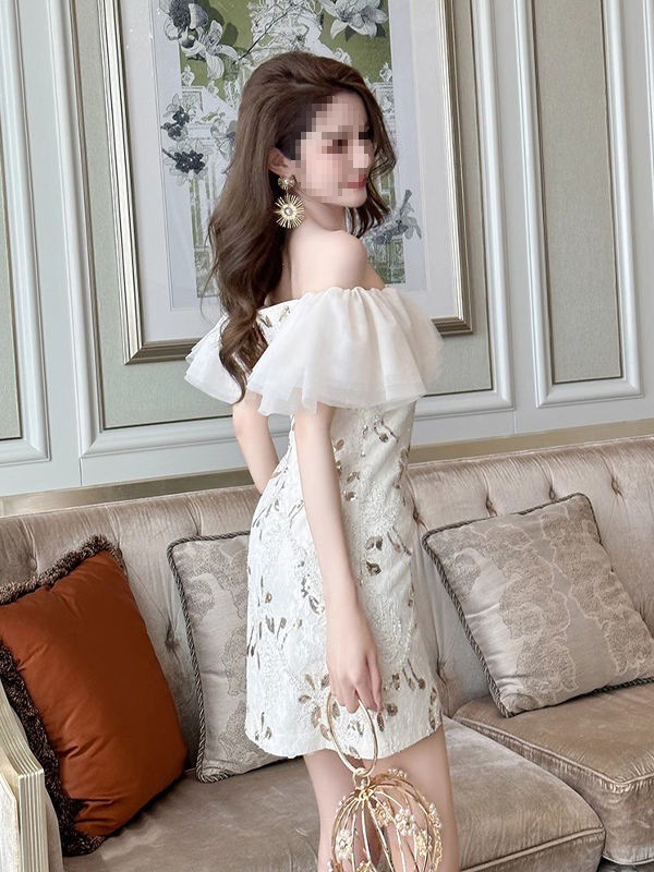 肩を美しく魅せるオフショルダーデザインに、ふんわりとしたフリルスリーブが女性らしさを演出します。