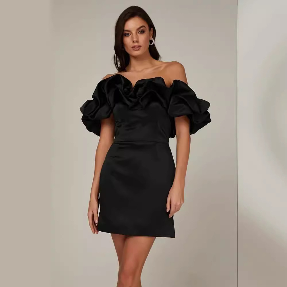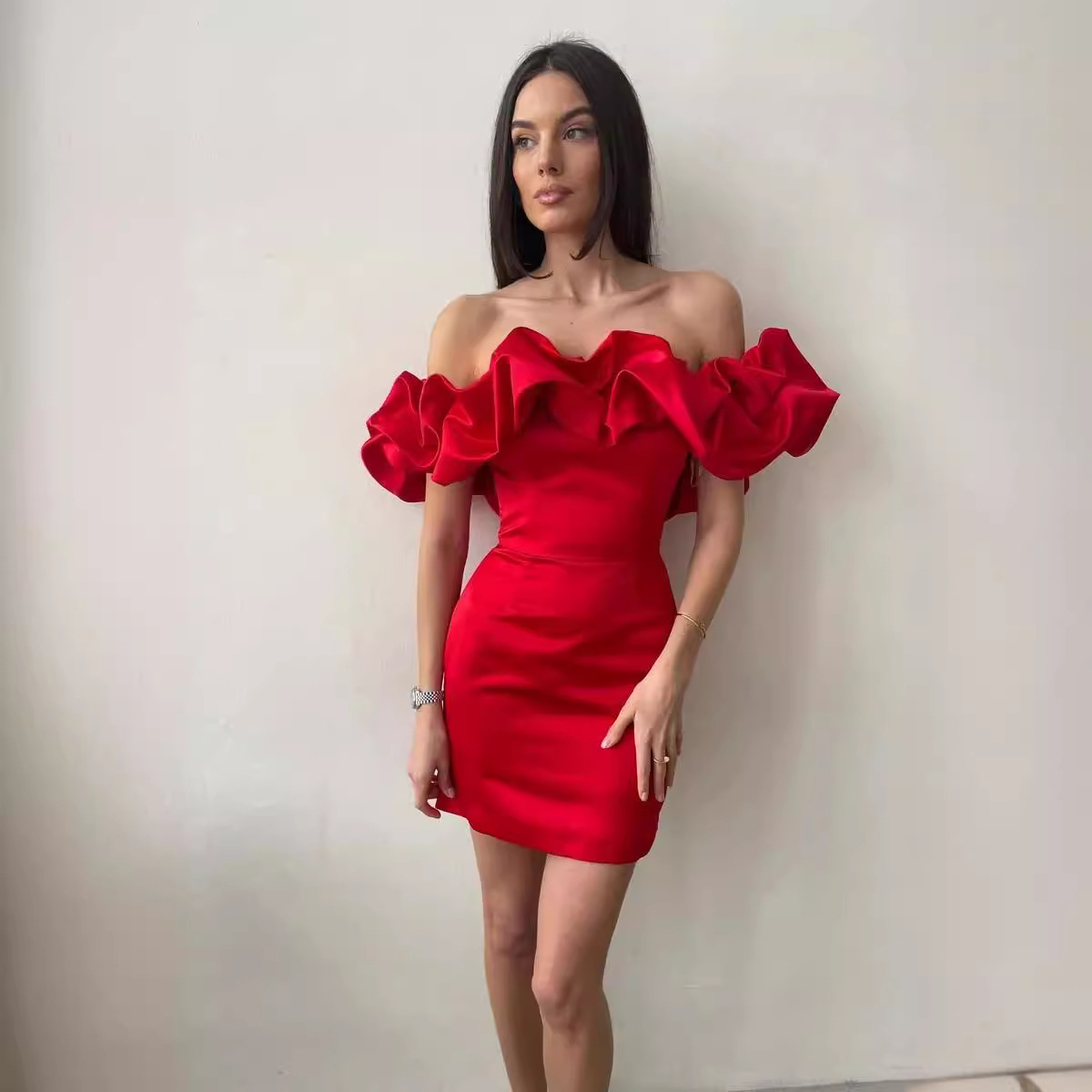 華やかなオフショルダーデザインが印象的なタイトミニドレスです。