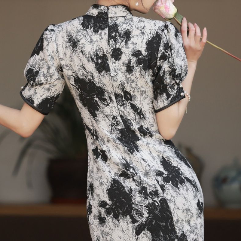立襟とチャイナボタン、胸元の切り替えがアクセントになり、パフスリーブが女性らしさを引き立てます。