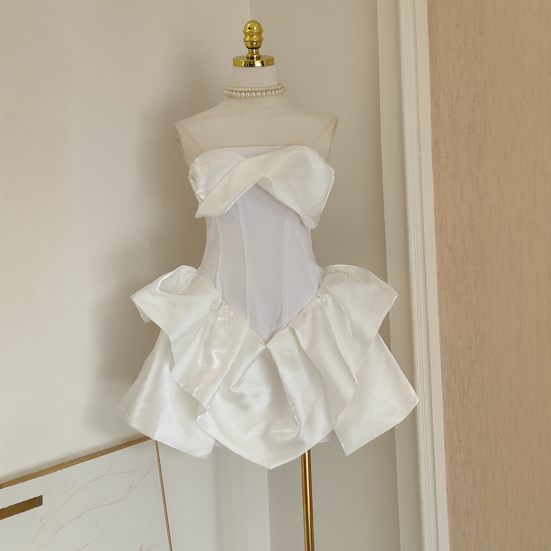 大胆な立体フリルが印象的なベアトップタイプのウエディングミニドレスです。