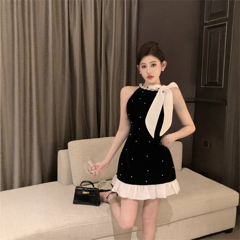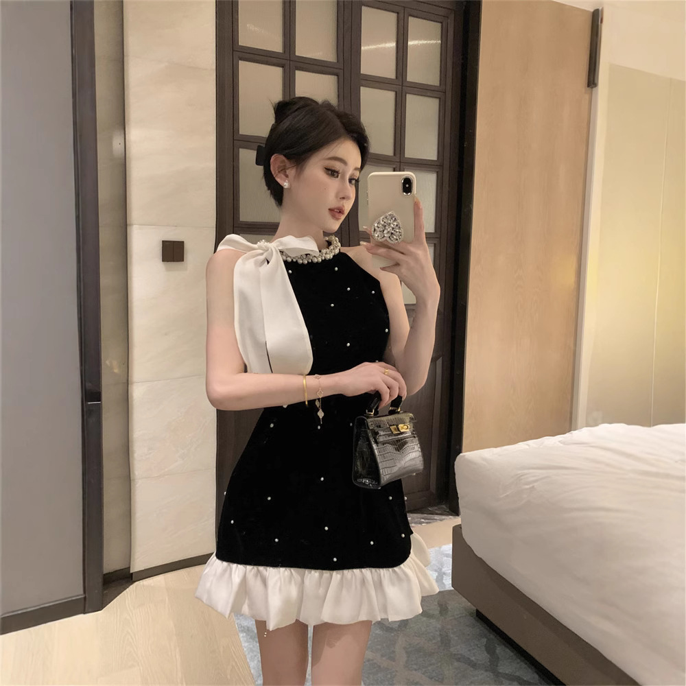ベルベット風の生地に散りばめられたパールが煌めき、裾のフリルが可愛らしさをプラス。