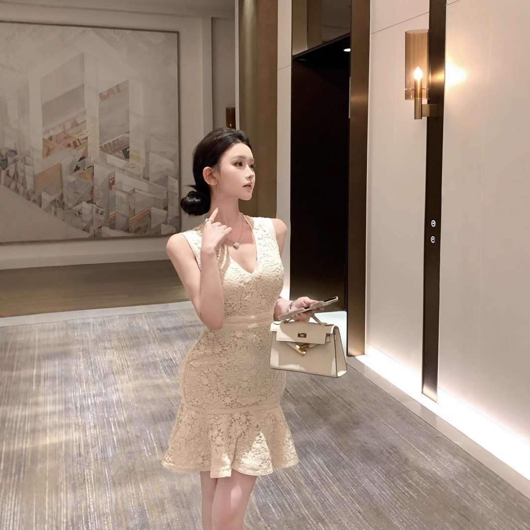 繊細な総レース素材が上品な印象を演出するマーメイドラインのミニドレスです。