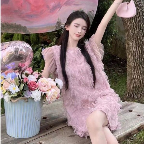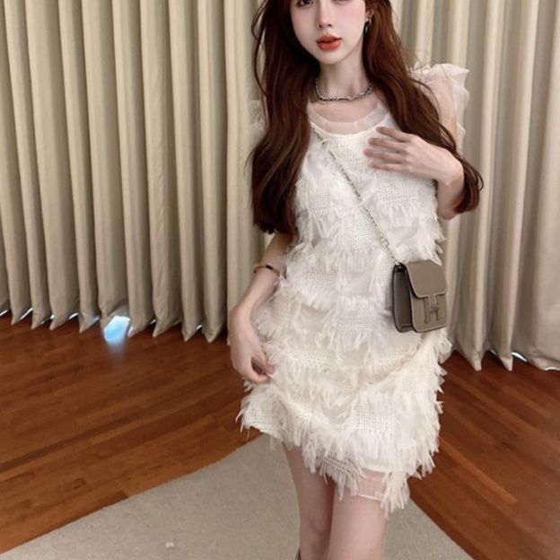 繊細なフェザーとフリンジをたっぷりとあしらった華やかなミニドレスです。
