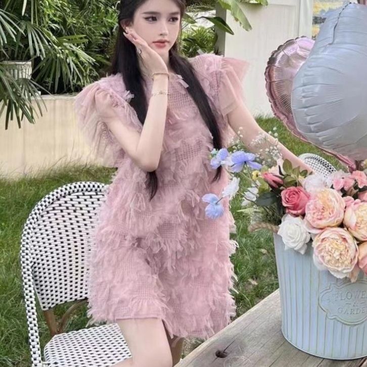 全体に施された羽根装飾が動くたびに揺れて、軽やかで優雅な印象を演出します。