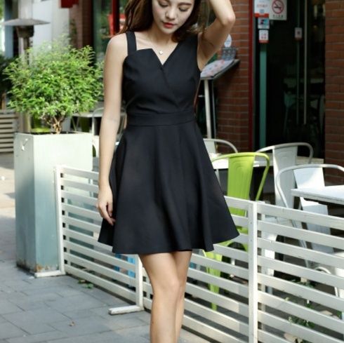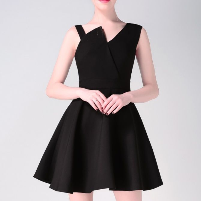 深めのブイネックラインが女性らしいデコルテを美しく演出するノースリーブのミニドレスです。
